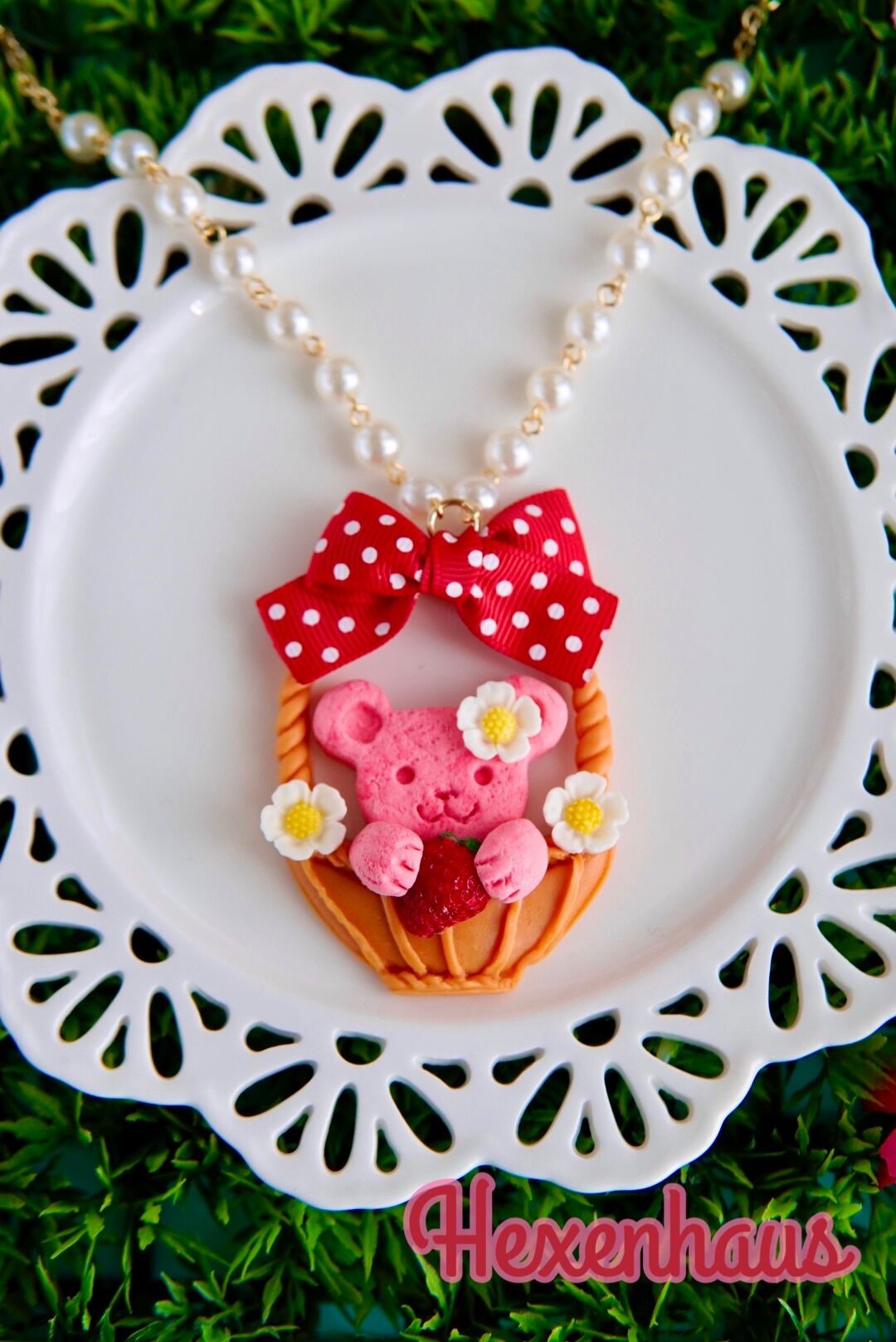 苺カラーのくまさんクッキーがバスケットに入ってしまったネックレスです!