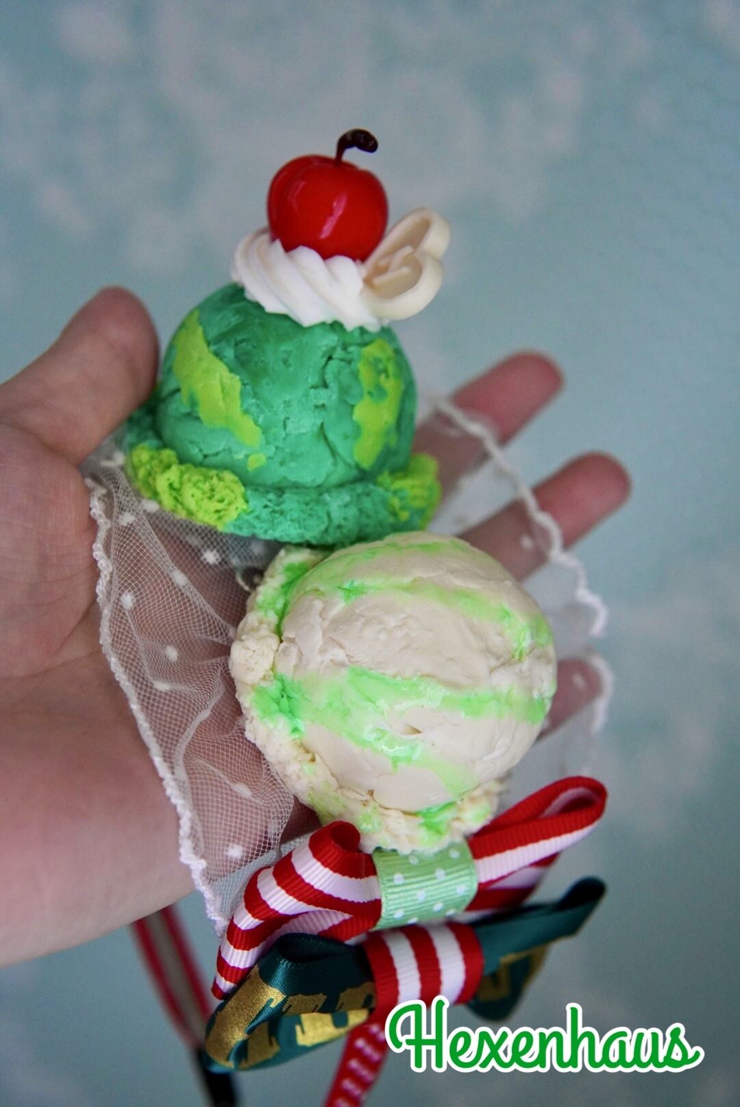 メロンソーダカラーのアイスにホイップクリーム、チェリーを乗せ、バニラアイスを添えました。